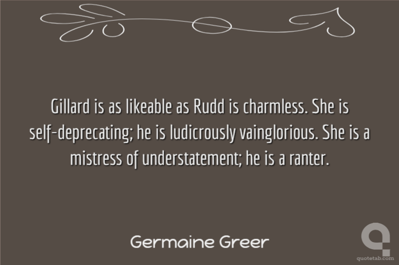 Gillard is as likeable as Rudd is charmless. She is self-deprecating; he is ludicrously vainglorious. She is a mistress of understatement; he is a ranter.