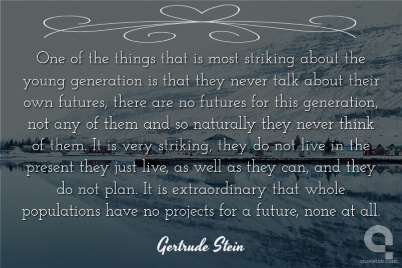One of the things that is most striking about the young generation is that they never talk about their own futures, there are no futures for this generation, not any of them and so naturally they never think of them. It is very striking, they do not live in the present they just live, as well as they can, and they do not plan. It is extraordinary that whole populations have no projects for a future, none at all.