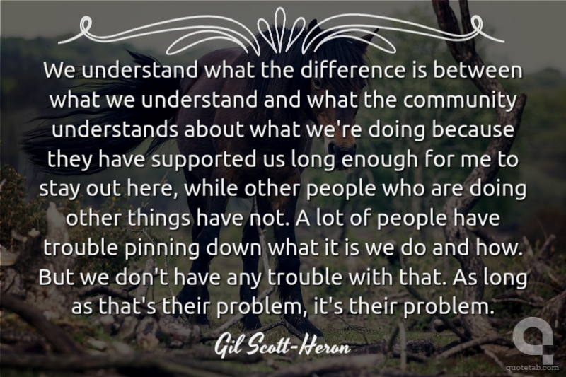 We understand what the difference is between what we understand and what the community understands about what we're doing because they have supported us long enough for me to stay out here, while other people who are doing other things have not. A lot of people have trouble pinning down what it is we do and how. But we don't have any trouble with that. As long as that's their problem, it's their problem.