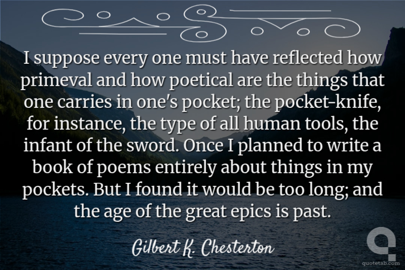 I suppose every one must have reflected how primeval and how poetical are the things that one carries in one's pocket; the pocket-knife, for instance, the type of all human tools, the infant of the sword. Once I planned to write a book of poems entirely about things in my pockets. But I found it would be too long; and the age of the great epics is past.