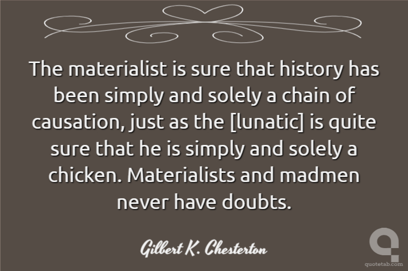 The materialist is sure that history has been simply and solely a chain of causation, just as the [lunatic] is quite sure that he is simply and solely a chicken. Materialists and madmen never have doubts.