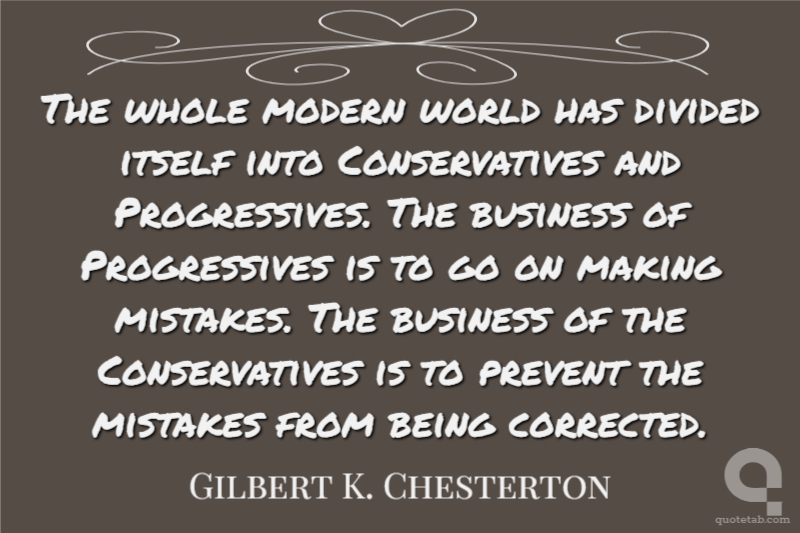 The whole modern world has divided itself into Conservatives and Progressives. The business of Progressives is to go on making mistakes. The business of the Conservatives is to prevent the mistakes from being corrected.