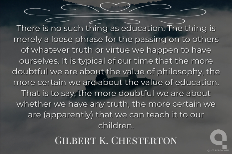 There is no such thing as education. The thing is merely a loose phrase for the passing on to others of whatever truth or virtue we happen to have ourselves. It is typical of our time that the more doubtful we are about the value of philosophy, the more certain we are about the value of education. That is to say, the more doubtful we are about whether we have any truth, the more certain we are (apparently) that we can teach it to our children.