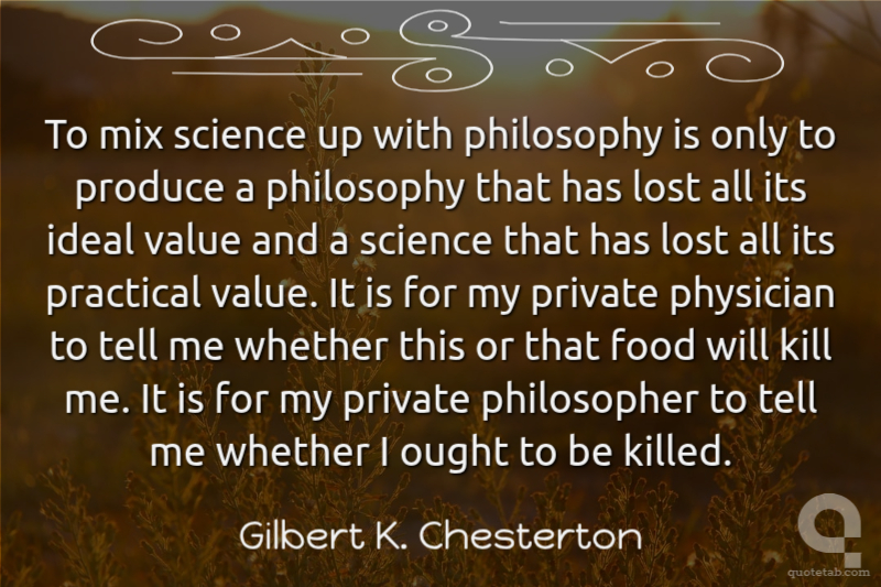 To mix science up with philosophy is only to produce a philosophy that has lost all its ideal value and a science that has lost all its practical value. It is for my private physician to tell me whether this or that food will kill me. It is for my private philosopher to tell me whether I ought to be killed.
