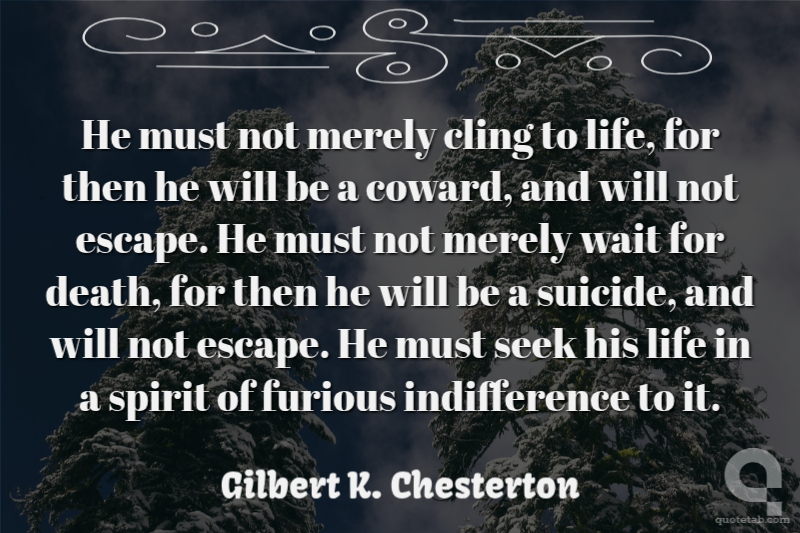 He must not merely cling to life, for then he will be a coward, and will not escape. He must not merely wait for death, for then he will be a suicide, and will not escape. He must seek his life in a spirit of furious indifference to it.