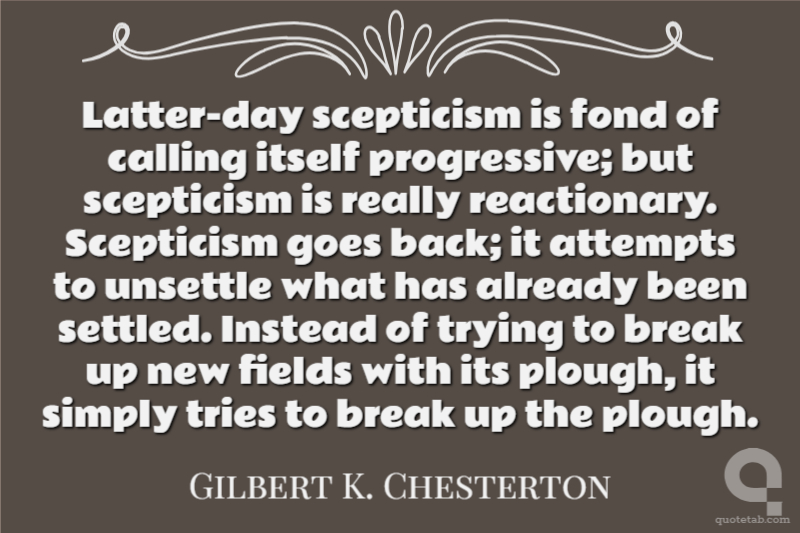 Latter-day scepticism is fond of calling itself progressive; but scepticism is really reactionary. Scepticism goes back; it attempts to unsettle what has already been settled. Instead of trying to break up new fields with its plough, it simply tries to break up the plough.