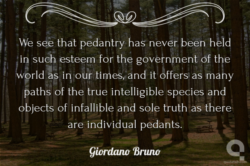 We see that pedantry has never been held in such esteem for the government of the world as in our times, and it offers as many paths of the true intelligible species and objects of infallible and sole truth as there are individual pedants.