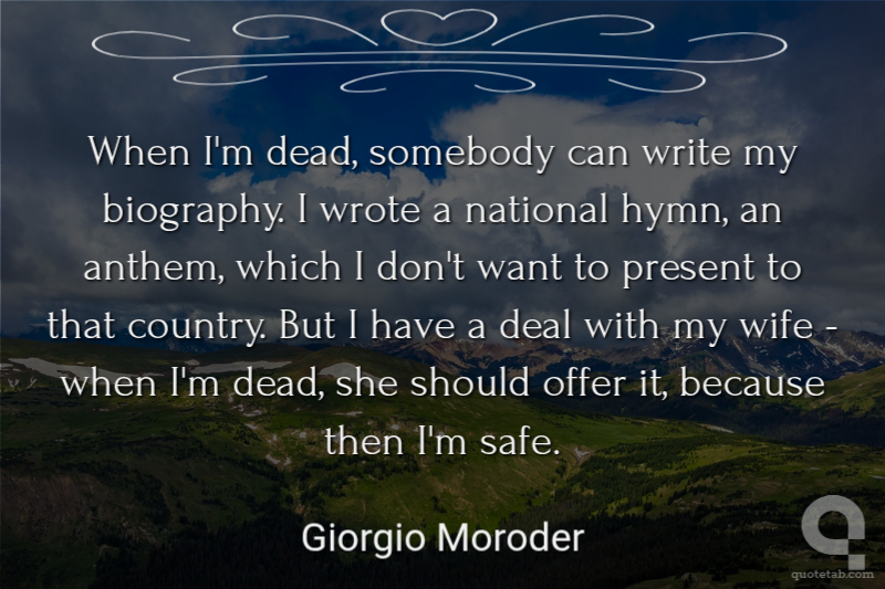 When I'm dead, somebody can write my biography. I wrote a national hymn, an anthem, which I don't want to present to that country. But I have a deal with my wife - when I'm dead, she should offer it, because then I'm safe.