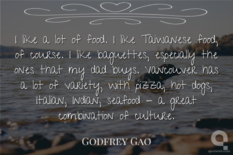 I like a lot of food. I like Taiwanese food, of course. I like baguettes, especially the ones that my dad buys. Vancouver has a lot of variety, with pizza, hot dogs, Italian, Indian, seafood - a great combination of culture.
