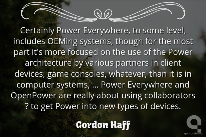 Certainly Power Everywhere, to some level, includes OEMing systems, though for the most part it's more focused on the use of the Power architecture by various partners in client devices, game consoles, whatever, than it is in computer systems, ... Power Everywhere and OpenPower are really about using collaborators ? to get Power into new types of devices.
