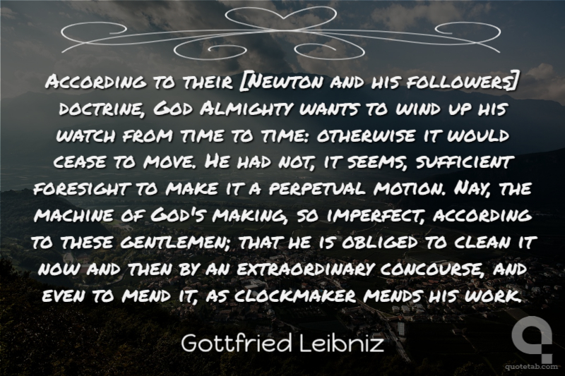 According to their [Newton and his followers] doctrine, God Almighty wants to wind up his watch from time to time: otherwise it would cease to move. He had not, it seems, sufficient foresight to make it a perpetual motion. Nay, the machine of God's making, so imperfect, according to these gentlemen; that he is obliged to clean it now and then by an extraordinary concourse, and even to mend it, as clockmaker mends his work.