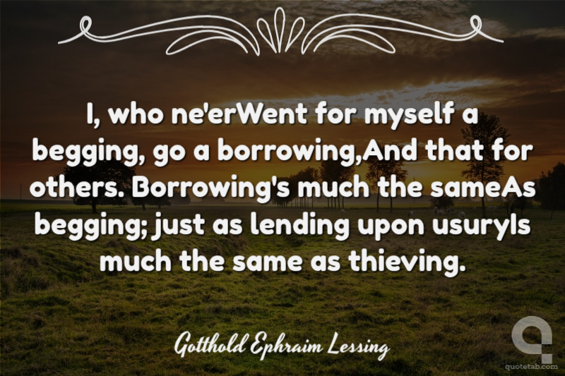 I, who ne'erWent for myself a begging, go a borrowing,And that for others. Borrowing's much the sameAs begging; just as lending upon usuryIs much the same as thieving.