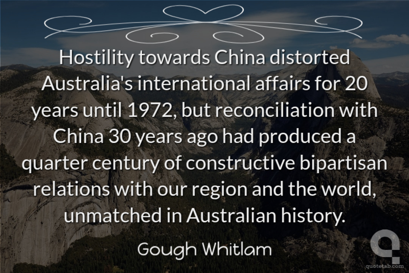 Hostility towards China distorted Australia's international affairs for 20 years until 1972, but reconciliation with China 30 years ago had produced a quarter century of constructive bipartisan relations with our region and the world, unmatched in Australian history.