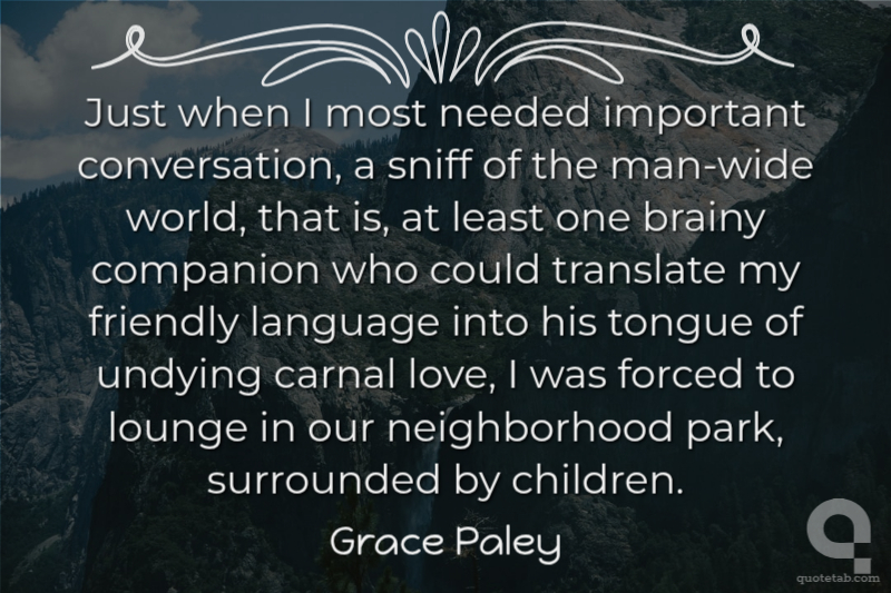 Just when I most needed important conversation, a sniff of the man-wide world, that is, at least one brainy companion who could translate my friendly language into his tongue of undying carnal love, I was forced to lounge in our neighborhood park, surrounded by children.