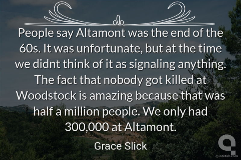 People say Altamont was the end of the 60s. It was unfortunate, but at the time we didnt think of it as signaling anything. The fact that nobody got killed at Woodstock is amazing because that was half a million people. We only had 300,000 at Altamont.