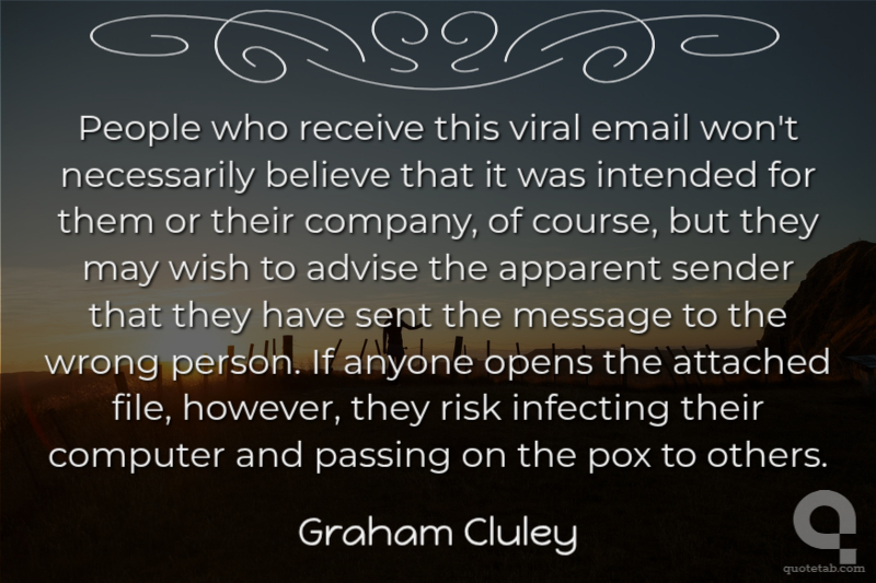 People who receive this viral email won't necessarily believe that it was intended for them or their company, of course, but they may wish to advise the apparent sender that they have sent the message to the wrong person. If anyone opens the attached file, however, they risk infecting their computer and passing on the pox to others.