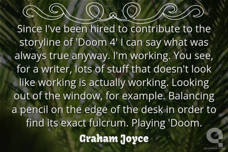 Since I've been hired to contribute to the storyline of 'Doom 4' I can say what was always true anyway. I'm working. You see, for a writer, lots of stuff that doesn't look like working is actually working. Looking out of the window, for example. Balancing a pencil on the edge of the desk in order to find its exact fulcrum. Playing 'Doom.