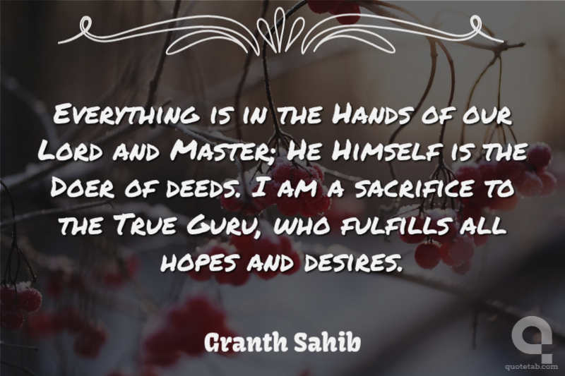 Everything is in the Hands of our Lord and Master; He Himself is the Doer of deeds. I am a sacrifice to the True Guru, who fulfills all hopes and desires.