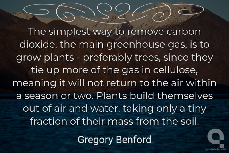 The simplest way to remove carbon dioxide, the main greenhouse gas, is to grow plants - preferably trees, since they tie up more of the gas in cellulose, meaning it will not return to the air within a season or two. Plants build themselves out of air and water, taking only a tiny fraction of their mass from the soil.