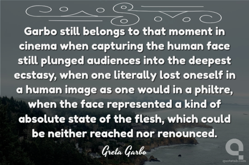 Garbo still belongs to that moment in cinema when capturing the human face still plunged audiences into the deepest ecstasy, when one literally lost oneself in a human image as one would in a philtre, when the face represented a kind of absolute state of the flesh, which could be neither reached nor renounced.