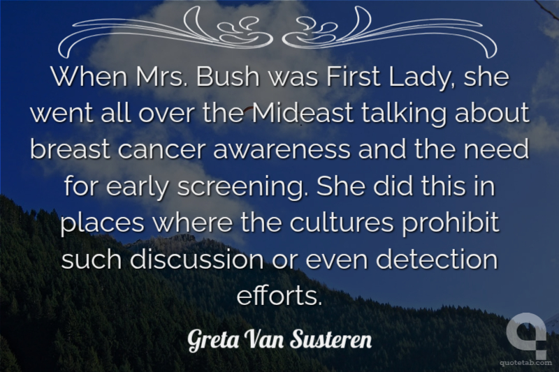 When Mrs. Bush was First Lady, she went all over the Mideast talking about breast cancer awareness and the need for early screening. She did this in places where the cultures prohibit such discussion or even detection efforts.