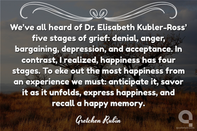 We’ve all heard of Dr. Elisabeth Kubler-Ross’ five stages of grief: denial, anger, bargaining, depression, and acceptance. In contrast, I realized, happiness has four stages. To eke out the most happiness from an experience we must: anticipate it, savor it as it unfolds, express happiness, and recall a happy memory.
