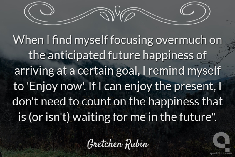 When I find myself focusing overmuch on the anticipated future happiness of arriving at a certain goal, I remind myself to 'Enjoy now'. If I can enjoy the present, I don't need to count on the happiness that is (or isn't) waiting for me in the future".