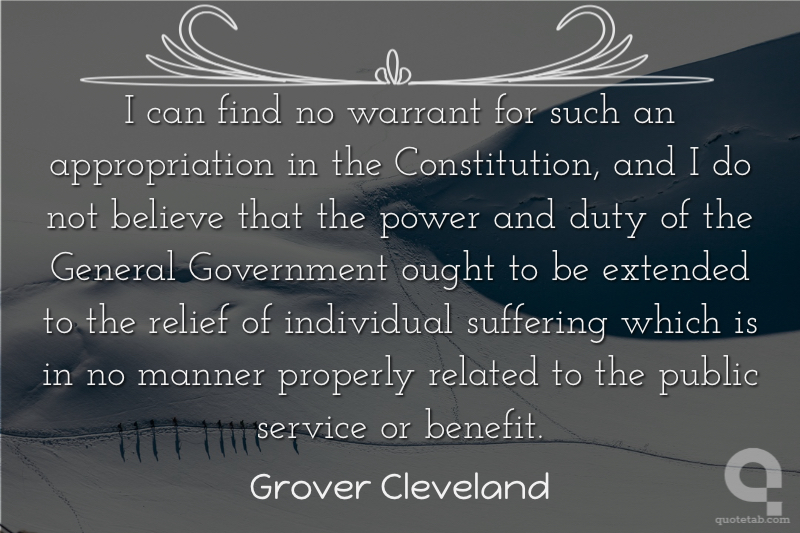 I can find no warrant for such an appropriation in the Constitution, and I do not believe that the power and duty of the General Government ought to be extended to the relief of individual suffering which is in no manner properly related to the public service or benefit.