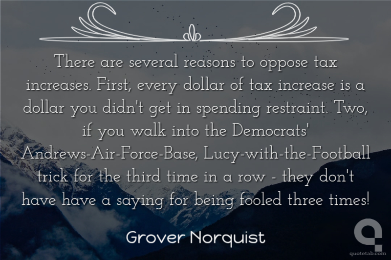 There are several reasons to oppose tax increases. First, every dollar of tax increase is a dollar you didn't get in spending restraint. Two, if you walk into the Democrats' Andrews-Air-Force-Base, Lucy-with-the-Football trick for the third time in a row - they don't have have a saying for being fooled three times!