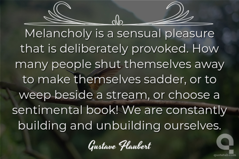 Melancholy is a sensual pleasure that is deliberately provoked. How many people shut themselves away to make themselves sadder, or to weep beside a stream, or choose a sentimental book! We are constantly building and unbuilding ourselves.