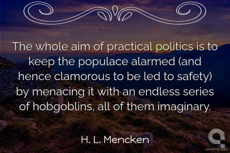 The whole aim of practical politics is to keep the populace alarmed (and hence clamorous to be led to safety) by menacing it with an endless series of hobgoblins, all of them imaginary.