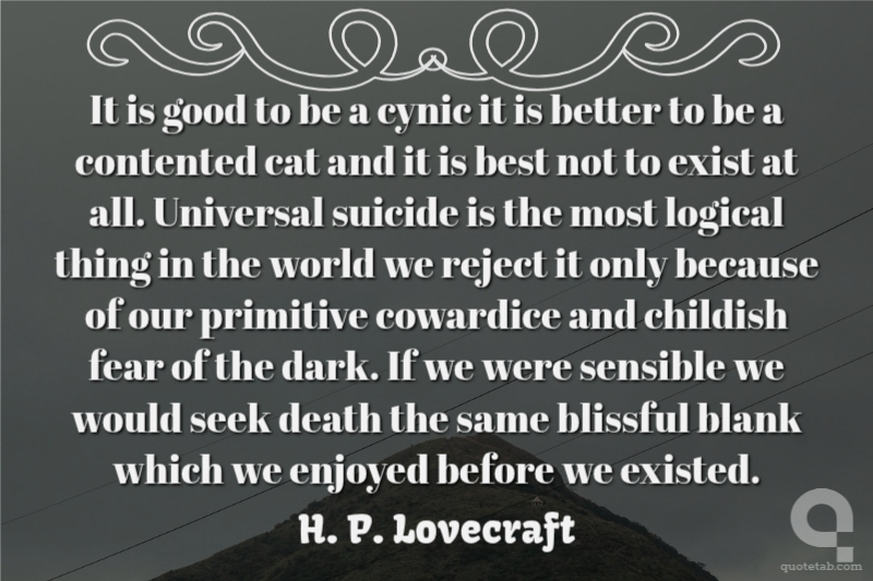 It is good to be a cynic it is better to be a contented cat and it is best not to exist at all. Universal suicide is the most logical thing in the world we reject it only because of our primitive cowardice and childish fear of the dark. If we were sensible we would seek death the same blissful blank which we enjoyed before we existed.