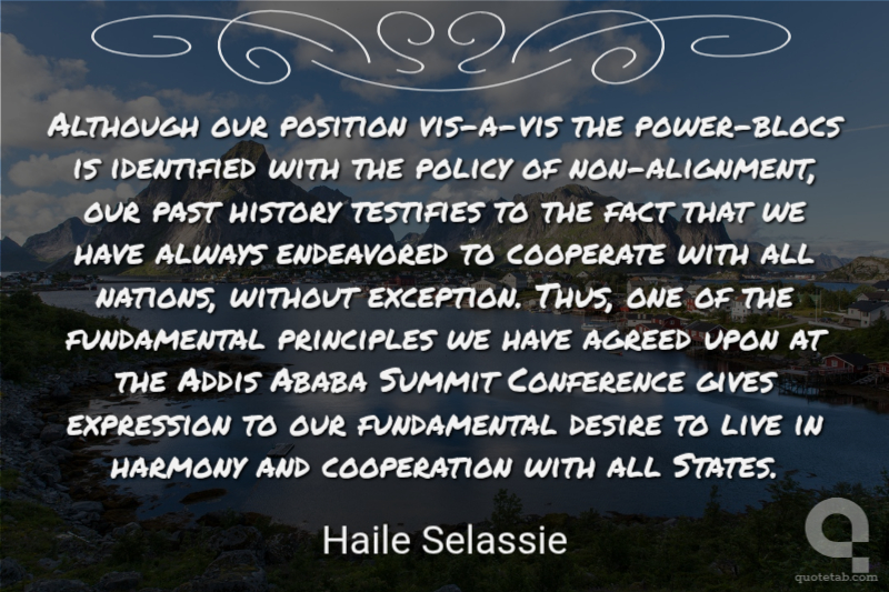 Although our position vis-a-vis the power-blocs is identified with the policy of non-alignment, our past history testifies to the fact that we have always endeavored to cooperate with all nations, without exception. Thus, one of the fundamental principles we have agreed upon at the Addis Ababa Summit Conference gives expression to our fundamental desire to live in harmony and cooperation with all States.