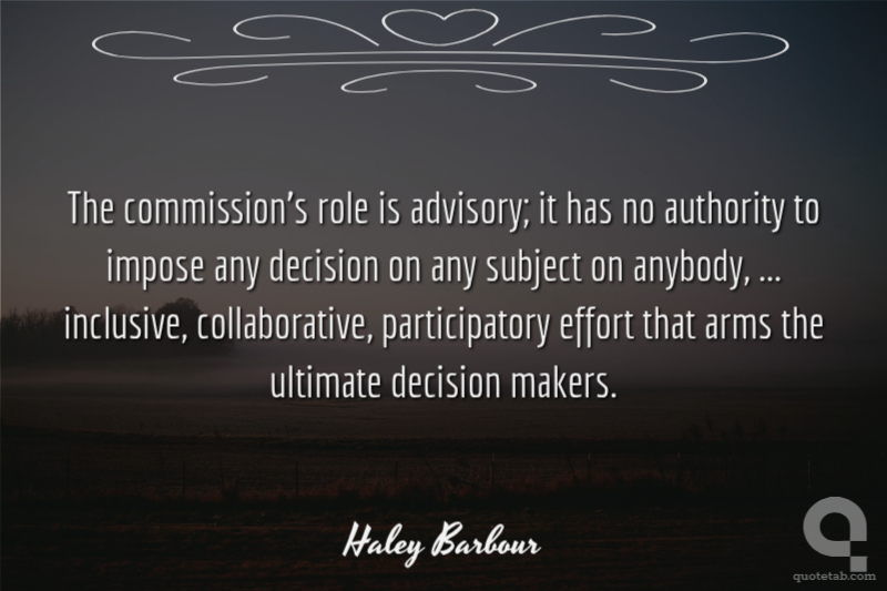 The commission's role is advisory; it has no authority to impose any decision on any subject on anybody, ... inclusive, collaborative, participatory effort that arms the ultimate decision makers.