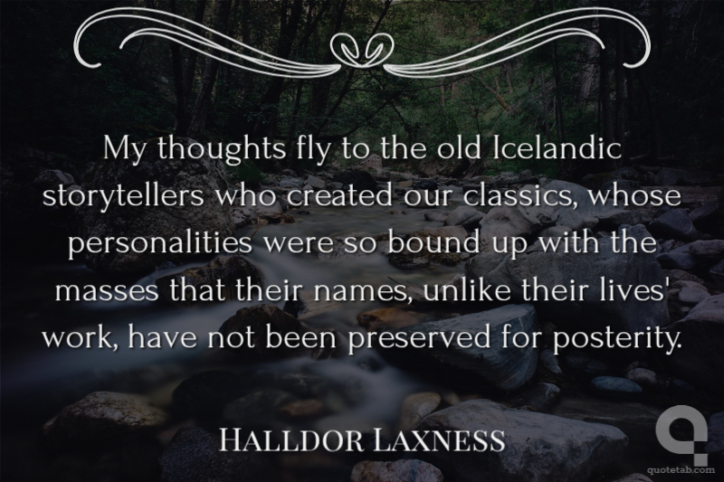 My thoughts fly to the old Icelandic storytellers who created our classics, whose personalities were so bound up with the masses that their names, unlike their lives' work, have not been preserved for posterity.