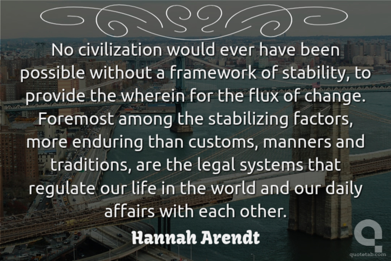 No civilization would ever have been possible without a framework of stability, to provide the wherein for the flux of change. Foremost among the stabilizing factors, more enduring than customs, manners and traditions, are the legal systems that regulate our life in the world and our daily affairs with each other.