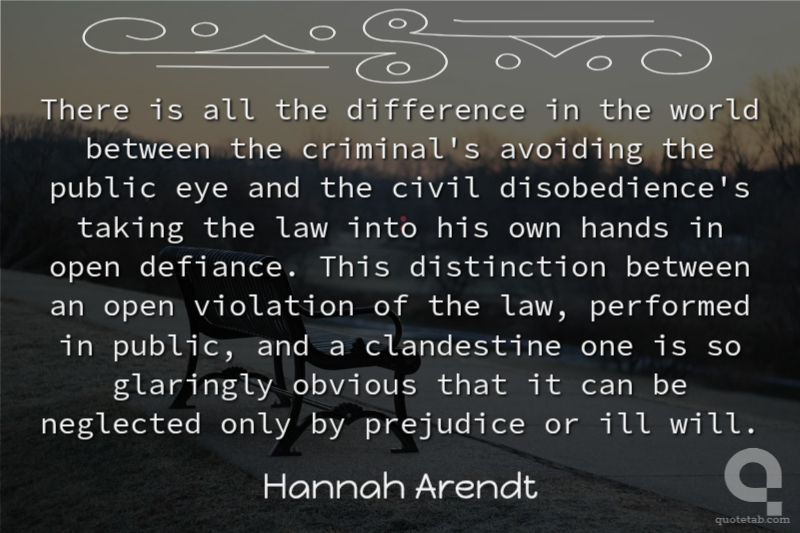 There is all the difference in the world between the criminal's avoiding the public eye and the civil disobedience's taking the law into his own hands in open defiance. This distinction between an open violation of the law, performed in public, and a clandestine one is so glaringly obvious that it can be neglected only by prejudice or ill will.
