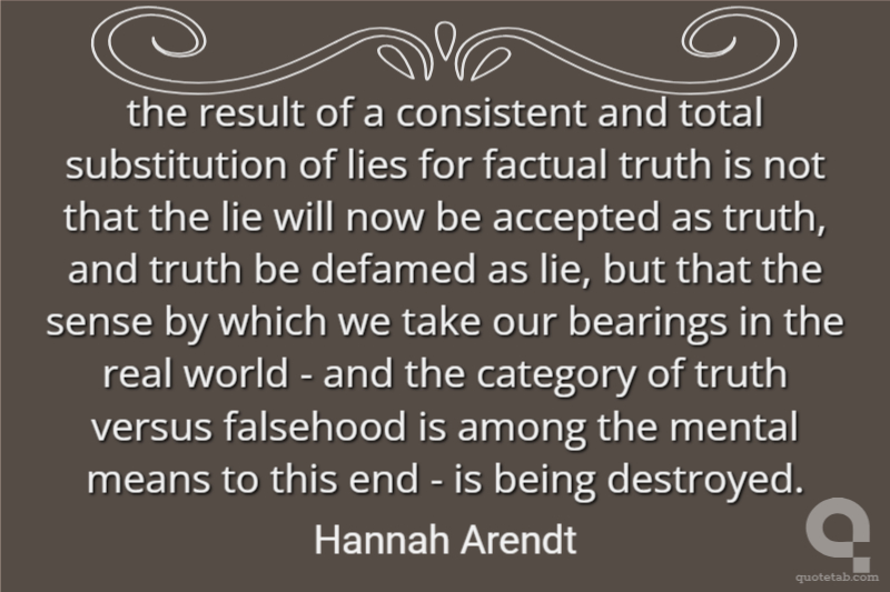 the result of a consistent and total substitution of lies for factual truth is not that the lie will now be accepted as truth, and truth be defamed as lie, but that the sense by which we take our bearings in the real world - and the category of truth versus falsehood is among the mental means to this end - is being destroyed.