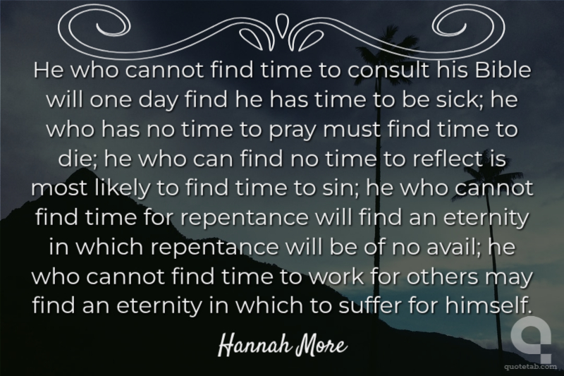 He who cannot find time to consult his Bible will one day find he has time to be sick; he who has no time to pray must find time to die; he who can find no time to reflect is most likely to find time to sin; he who cannot find time for repentance will find an eternity in which repentance will be of no avail; he who cannot find time to work for others may find an eternity in which to suffer for himself.