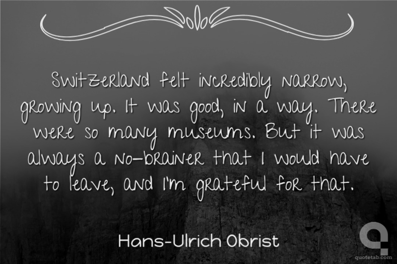 Switzerland felt incredibly narrow, growing up. It was good, in a way. There were so many museums. But it was always a no-brainer that I would have to leave, and I'm grateful for that.