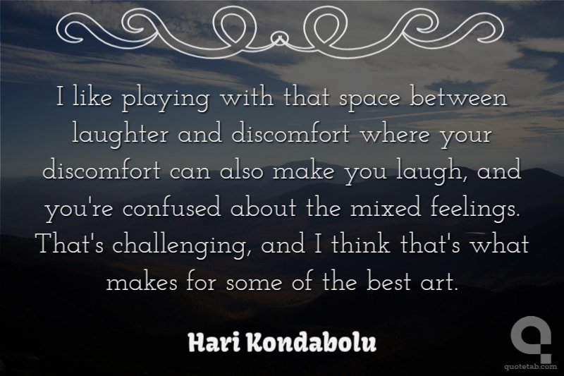 I like playing with that space between laughter and discomfort where your discomfort can also make you laugh, and you're confused about the mixed feelings. That's challenging, and I think that's what makes for some of the best art.