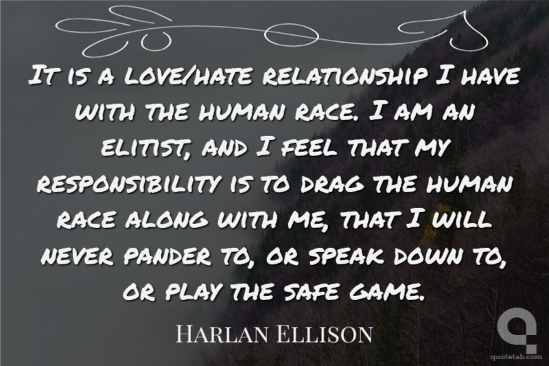 It is a love/hate relationship I have with the human race. I am an elitist, and I feel that my responsibility is to drag the human race along with me, that I will never pander to, or speak down to, or play the safe game.