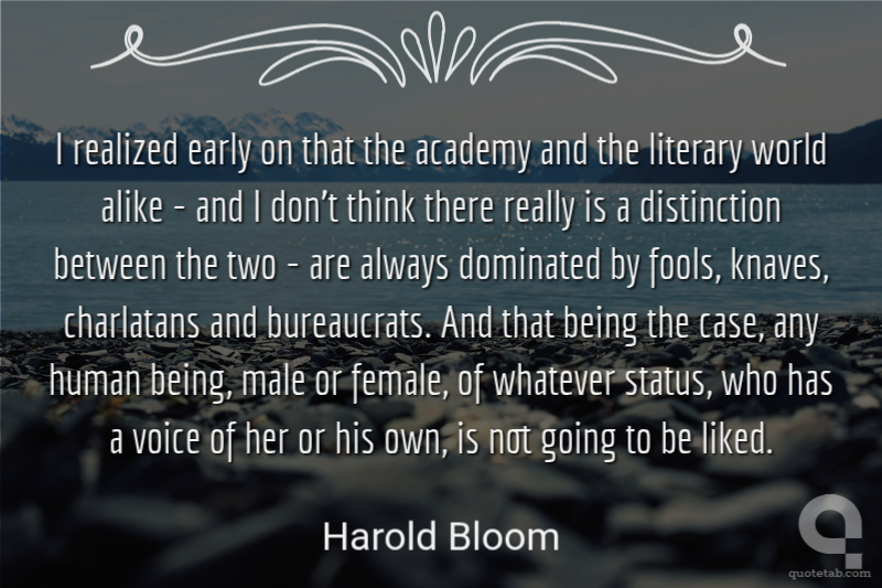 I realized early on that the academy and the literary world alike - and I don't think there really is a distinction between the two - are always dominated by fools, knaves, charlatans and bureaucrats. And that being the case, any human being, male or female, of whatever status, who has a voice of her or his own, is not going to be liked.