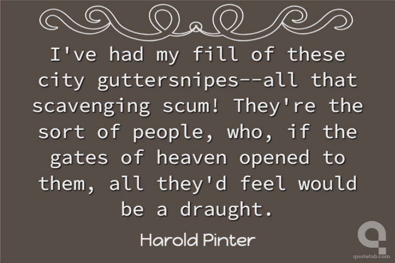 I've had my fill of these city guttersnipes--all that scavenging scum! They're the sort of people, who, if the gates of heaven opened to them, all they'd feel would be a draught.