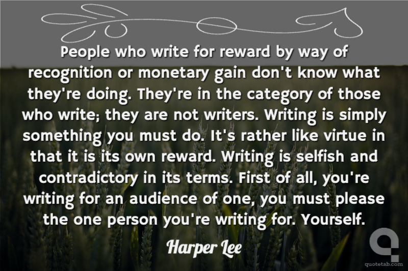 People who write for reward by way of recognition or monetary gain don't know what they're doing. They're in the category of those who write; they are not writers. Writing is simply something you must do. It's rather like virtue in that it is its own reward. Writing is selfish and contradictory in its terms. First of all, you're writing for an audience of one, you must please the one person you're writing for. Yourself.