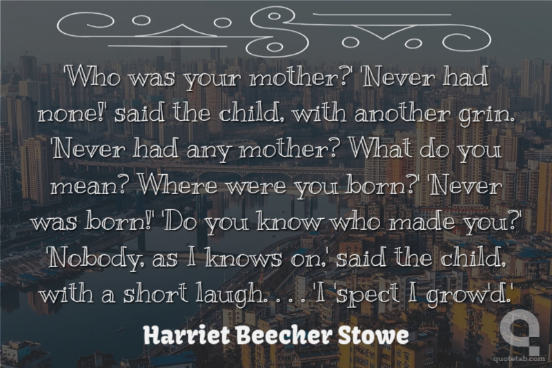 'Who was your mother?' 'Never had none!' said the child, with another grin. 'Never had any mother? What do you mean? Where were you born?' 'Never was born!' 'Do you know who made you?' 'Nobody, as I knows on,' said the child, with a short laugh. . . . 'I 'spect I grow'd.'