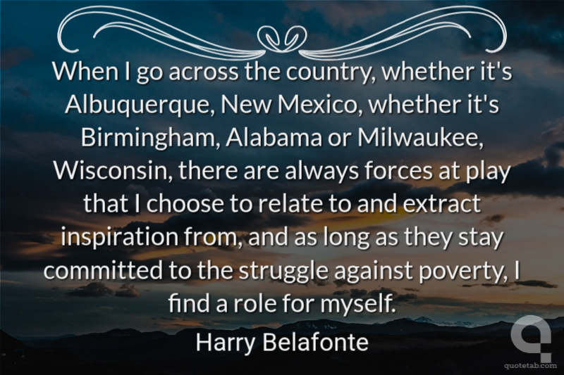 When I go across the country, whether it's Albuquerque, New Mexico, whether it's Birmingham, Alabama or Milwaukee, Wisconsin, there are always forces at play that I choose to relate to and extract inspiration from, and as long as they stay committed to the struggle against poverty, I find a role for myself.