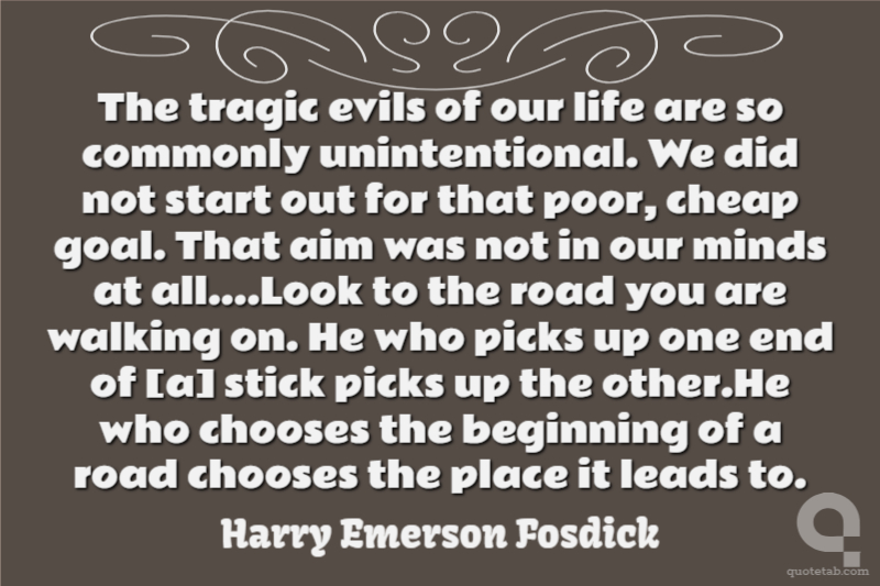 The tragic evils of our life are so commonly unintentional. We did not start out for that poor, cheap goal. That aim was not in our minds at all....Look to the road you are walking on. He who picks up one end of [a] stick picks up the other.He who chooses the beginning of a road chooses the place it leads to.