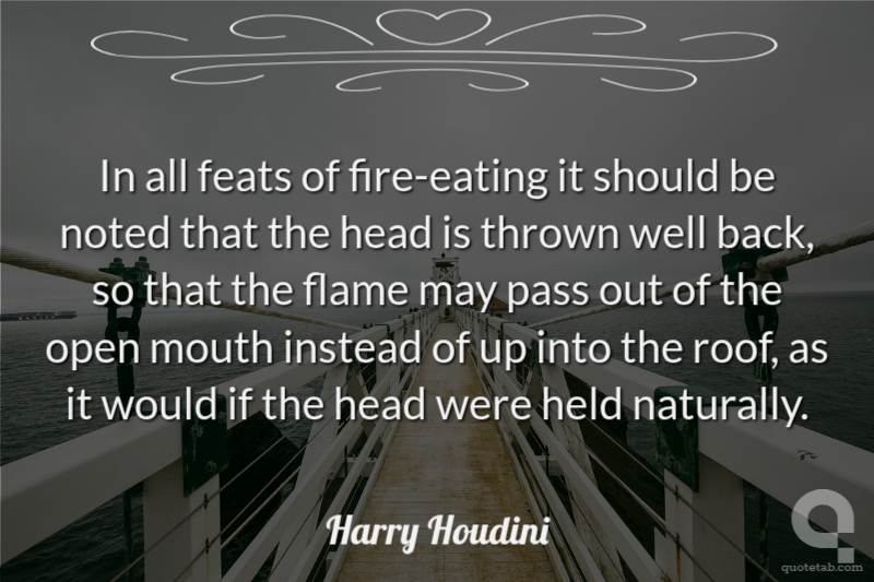 In all feats of fire-eating it should be noted that the head is thrown well back, so that the flame may pass out of the open mouth instead of up into the roof, as it would if the head were held naturally.