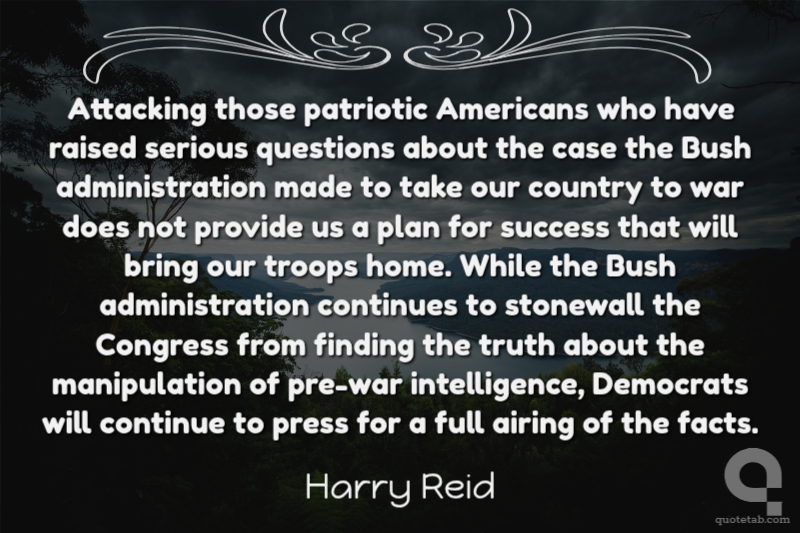 Attacking those patriotic Americans who have raised serious questions about the case the Bush administration made to take our country to war does not provide us a plan for success that will bring our troops home. While the Bush administration continues to stonewall the Congress from finding the truth about the manipulation of pre-war intelligence, Democrats will continue to press for a full airing of the facts.